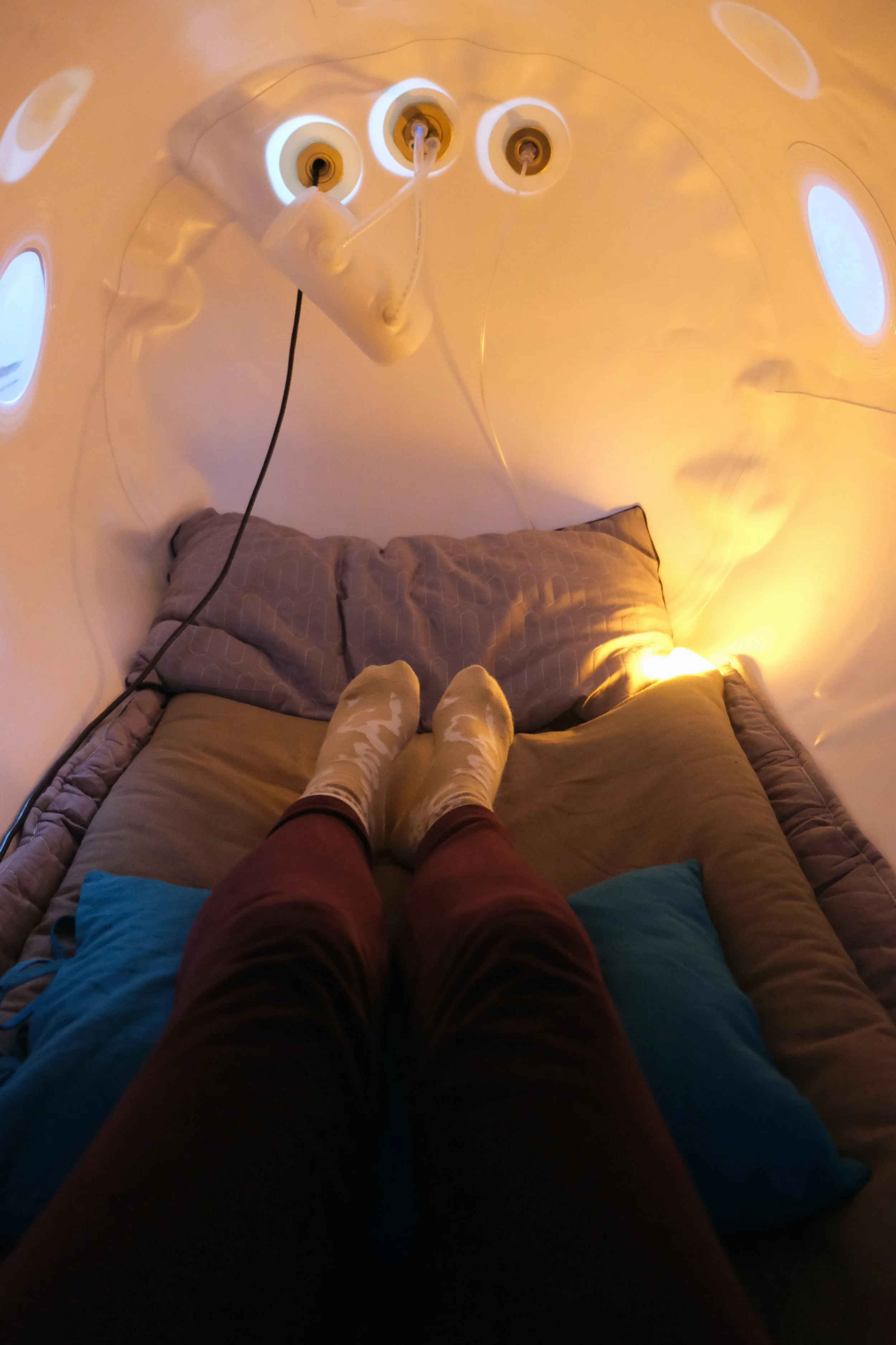 During your first visit you will complete a new client intake form, and we will explain how the chamber works and what you can expect. Your session will begin with the chamber gradually increasing in pressure. During this time, you may notice a feeling of fullness or popping in your ears, similar to what you experience on an airplane. This usually lasts around 10 minutes and can be eased by swallowing or yawning. The same sensation may occur again as the chamber gently returns to normal pressure at the end of your session.
